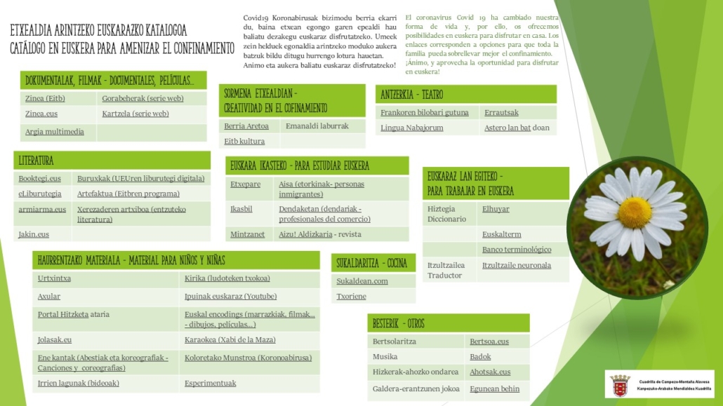Covid19 Koronabirusak bizimodu berria ekarri du, baina etxean egongo garen epealdi hau baliatu dezakegu euskaraz disfrutatzeko. Umeek zein helduek egonaldia arintzeko moduko aukera batzuk bildu ditugu hurrengo lotura hauetan.