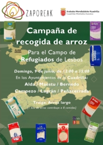 La Cuadrilla de Montaña Alavesa, en colaboración con la ONG Zaporeak y los seis ayuntamientos de la comarca, ha organizado una recogida de arroz largo para el domingo 9 de junio de 12:00 a 15:00.